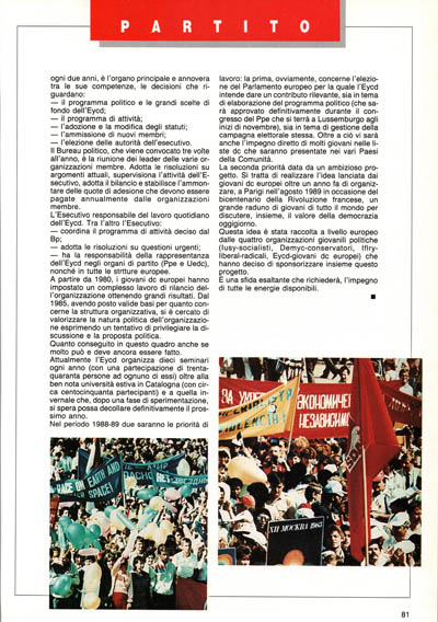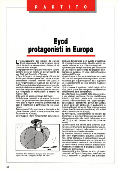 Nel periodo 1988-89 due saranno le priorità di lavoro: la prima, ovviamente, concerne l'elezione del Parlamento europeo per la quale l'EYCD intende dare un contributo rilevante, sia in tema di elaborazione del programma politico (che sarà approvato definitivamente durante il congresso del PPE che si terrà a Lussemburgo agli inizi di novembre), sia in tema di gestione della campagna elettorale stessa. Oltre a ciò vi sarà anche l'impegno diretto di molti giovani nelle liste dc che saranno presentate nei vari Paesi della Comunità.