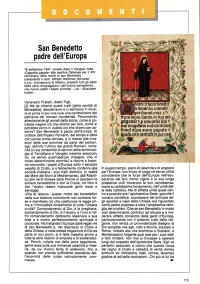In questo tempo, pieno di calamità e di angosce per l'Europa, non è fuor di luogo né senza utilità considerare che le forze dell'Europa nell'esuberanza del loro intimo vigore e la sua lunga prestanza civili trovarono la loro consistenza, come su solidissimo fondamento, nell'unità della fede cattolica. Ma di siffatta unità quasi centro e presidio era l'apostolica Sede: giacché il romano pontefice, successore del principe degli apostoli e capo della Chiesa, era riguardato come padre preposto a tutta l'amplissima famiglia dei cristiani. Che se san Benedetto in modo così determinante contribuì ad attuare e a moderare siffatto consorzio delle genti d'Europa, particolarmente con il sollecito culto della religione, non senza un provvidenziale disegno di Dio accadde che egli, nato a Norcia, educato a Roma, iniziato alla vita eremitica a Subiaco, a Montecassino fulgente qual sole per i suoi detti e fatti mirabili, non mai si trovasse a operare lungi dal cospetto dell'apostolica Sede. Egli va pertanto associato a coloro che questa rocca del regno di Cristo e cattedra di verità «fortes ambiunt ex fortissimis Israel, omnes tenentes gladios et ad bella doctissimi». Chi più di lui ha venerato e prediletto l'apostolica Sede? Che se poi vogliamo ripercorrere le meritorie gesta dei suoi figli, a buon diritto andrebbe detto che l'ordine benedettino, per ininterrotto volger di secoli, costituì per la Chiesa cattolica un inespugnabile baluardo.