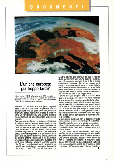 Appunto una simile preoccupazione ci ispirava il 2 giugno scorso, quando parlammo in favore di una unione europea. Lo facemmo badando bene di non coinvolgere la Chiesa in interessi puramente temporali. Medesima riserva conviene fare riguardo al problema di sapere quale grado di verosimiglianza o di probabilità attribuire alla attuazione di questo ideale, di quanto sia ancora lontano o di quanto si sia avvicinato. Che la costituzione di una unione europea presenti serie difficoltà, nessuno lo mette in dubbio. Di primo acchito si potrebbe invocare la necessità, per renderla psicologicamente accettabile a tutti i popoli d'Europa, di una certa prospettiva storica che allontani da essi il ricordo degli avvenimenti dell'ultima guerra. Tuttavia, non v'è tempo da perdere. E se si ha a cuore che questa unione raggiunga il suo scopo, se si vuole che essa serva utilmente la causa della libertà e della concordia europea, la causa della pace economica e politica intercontinentale, è urgente che essa si faccia. Taluni si domandano persino se non è già troppo tardi.