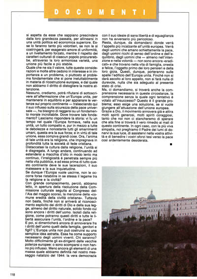Con grande compiacimento, perciò, abbiamo letto, in apertura della risoluzione della Commissione culturale seguita al Congresso dell'Aia del maggio scorso, la menzione della «comune eredità della civiltà cristiana». Tuttavia non basta, finché non si arriverà al riconoscimento esplicito dei diritti di Dio e della sua legge, almeno del diritto naturale, solido fondo cui sono ancora i diritti dell'uomo. Isolati dalla religione, come potranno questi diritti e tutte le libertà assicurare l'unità, l'ordine e la pace?