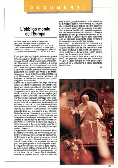 L'apporto dei capitali e delle tecniche dell'Europa costituisce un servizio insostituibile, che accelererà lo sviluppo economico dei paesi africani. Sviluppo urgente, come ognuno sa, poiché nel mondo moderno l'interdipendenza economica è divenuta tale, che un paese sottosviluppato non può godere di una completa libertà. L'ineguale ripartizione dei doni e delle ricchezze della natura obbliga moralmente gli uomini ad aiutarsi gli uni gli altri, ognuno secondo i lumi e le forze che ha ricevuto. Un simile obbligo assume proporzioni via via crescenti nella mi