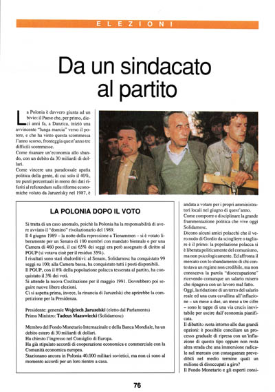 Per ora Walesa e Mazowiecki coabitano. Il secondo ha avuto bisogno del primo per domare lo sciopero generale di giugno, il primo sollecita il Governo a introdurre le riforme promesse ma mai attuate. Su un punto i due si sono trovati d'accordo: sull'estromissione dal Governo dei comunisti il 6 luglio che ha azzerato gli accordi della tavola rotonda dell'anno scorso; la prossima primavera, probabilmente, si voterà in elezioni completamente libere. In questa situazione, Solidarnosc ha festeggiato il decimo anniversario della rivoluzione di Danzica.