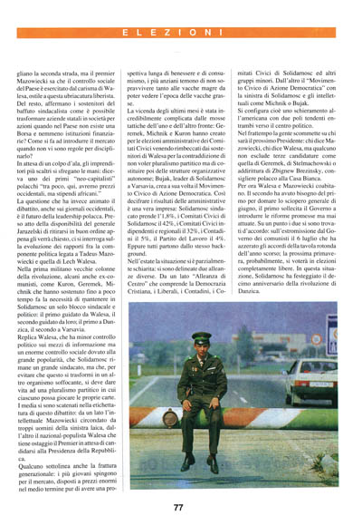 Nell'estate la situazione si è parzialmente schiarita: si sono delineate due alleanze diverse. Da un lato "Alleanza di Centro" che comprende la Democrazia Cristiana, i Liberali, i Contadini, i Comitati Civici di Solidarnosc ed altri gruppi minori. Dall'altro il "Movimento Civico di Azione Democratica" con la sinistra di Solidarnosc e gli intellettuali come Michnik o Bujak.