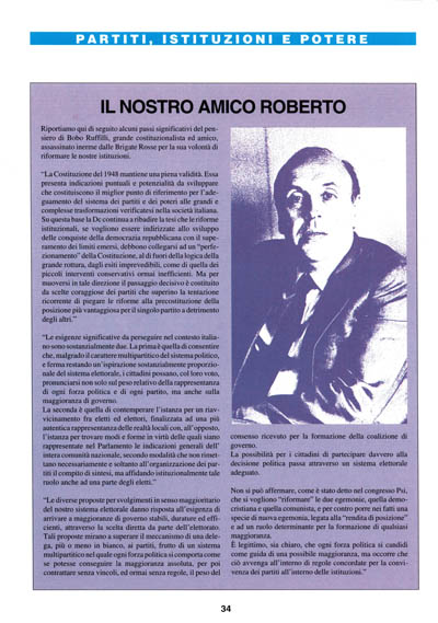 Riportiamo qui di seguito alcuni passi significativi del pensiero di Bobo Ruffilli, grande costituzionalista ed amico, assassinato inerme dalle Brigate Rosse per la sua volontà di riformare le nostre istituzioni.