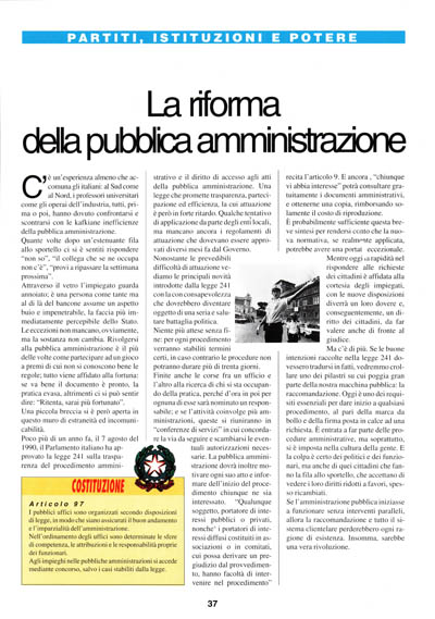 Ma c'è di più. Se le buone intenzioni raccolte nella legge 241 dovessero tradursi in fatti, vedremmo crollare uno dei pilastri su cui poggia gran parte della nostra macchina pubblica: la raccomandazione. Oggi è uno dei requisiti essenziali per dare inizio a qualsiasi procedimento, al pari della marca da bollo e della firma posta in calce ad una richiesta. È entrata a far parte delle procedure amministrative, ma soprattutto, si è imposta nella cultura della gente. E la colpa è certo dei politici e dei funzionari, ma anche di quei cittadini che fanno la fila allo sportello, che accettano di vedere i loro diritti ridotti a favori, spesso ricambiati.