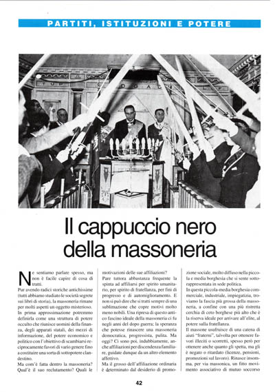Pur avendo radici storiche antichissime (tutti abbiamo studiato le società segrete sui libri di storia), la massoneria rimane per molti aspetti un oggetto misterioso. In prima approssimazione potremmo definirla come una struttura di potere occulto che riunisce uomini della finanza, degli apparati statali, dei mezzi di informazione, del potere economico e politico con 1'obiettivo di scambiarsi reciprocamente favori di vario genere fino a costituire una sorta di sottopotere clandestino.