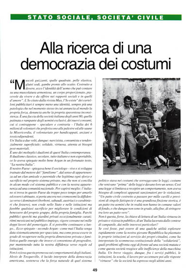 Muscoli guizzanti, spalle quadrate, pelle elastica, glutei sodi, gambe pronte allo scatto. Costruito a dovere, ecco l'identikit dell'uomo che può contare su una muscolatura armoniosa, un corpo proporzionato, piacevole da vivere e da offrire nei rapporti sociali e in quelli d'amore". L'Io citato dalla rivista Max, l"Io esiste" dei cartelloni pubblicitari è sempre meno una identità, sempre più una patologia che nel momento stesso in cui annuncia al mondo la propria forza, denuncia anche la propria spaventosa inconsistenza. È una faccia della società italiana degli anni 80, quella patinata e rampante degli uomini esclusivi, dei nuovi consumi, cui si contrappone – speculare e contraria – l'Italia dei 6 milioni di volontari che preferiscono alle palestre ed alle saune la Misericordia, il volontariato per handicappati, anziani e tossicodipendenti.