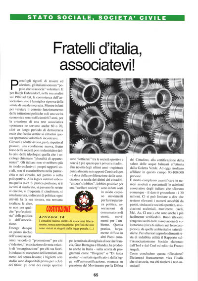 Portafogli rigonfi di tessere ed adesioni, gli italiani sono un "popolo che si associa" volentieri. E per Ralph Dahrendorf, nella sua analisi sul 1989 ad Est, la consistenza dell'associazionismo è la miglior riprova della salute di una democrazia. Mentre infatti per valutare il corretto funzionamento delle istituzioni politiche o di una scelta economica sono sufficienti 6/7 anni, per la creazione di una rete associativa spontanea ne servono anche 60 o 70, cioè un lungo periodo di democrazia reale che faccia sentire ai cittadini questa spontanea volontà di incontrarsi.