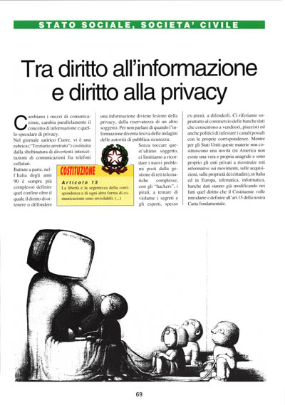 Battute a parte, nell'Italia degli anni 90 è sempre più complesso definire quel confine oltre il quale il diritto di ottenere o diffondere una informazione diviene lesione della privacy, della riservatezza di un altro soggetto. Per non parlare di quando l'informazione diventa lesiva delle indagini delle autorità di pubblica sicurezza.