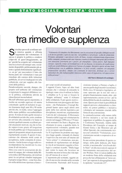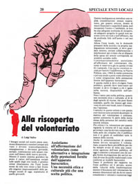 Si rischia spesso di sconfinare nella retorica quando si affronta l'argomento del volontariato. E spesso è proprio la politica a rendersi colpevole di quest'atteggiamento, un po' perché ha scoperto nel volontariato una ricca riserva di energie sane, socialmente disponibili, politicamente più attente e quindi elettoralmente significative, un po' per nascondersi il fatto che buona parte del volontariato è nata per rimediare alle carenze delle istituzioni pubbliche, di servizi inadeguati resi alla collettività, cioè per supplire alle funzioni della politica.