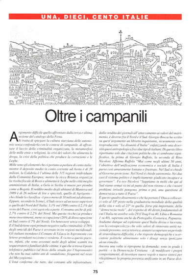 Mille sono gli elementi che ci portano a parlare di cento italie: mentre il deposito medio in conto corrente ad Aosta è di 38 milioni, la Calabria è l'ultima delle 115 regioni individuate dalla Comunità Europea; mentre la ricca Brianza organizza la rivolta fiscale di Bossi e alimenta le Leghe nelle città meglio amministrate di Italia, a Gela in Sicilia si muore per piombo come a Bogotà. Il reddito medio degli abitanti di Mantova nel 1989 è di 26 milioni di lire e spiccioli, quello di Agrigento – che chiude la classifica – è poco meno di 10 milioni ad abitante. Eppure, secondo lo Svimez, il Sud cresce ad un tasso superiore a quello del Nord dell'Italia: 3,1% nel 1990 contro il 2,1% del resto del Paese, crisi agricola a parte. Consuma anche di più: 2,7% contro il 2,2% del Nord. Ma questa ricchezza produce meno investimenti, meno occupazione (20% di disoccupazione al Sud contro il 7% del Nord). Un benessere senza sviluppo. E il Sud detiene ogni primato negativo sulla criminalità: il 76% degli omicidi del Paese è avvenuto in tre regioni meridionali. Gli italiani inondano il Comune di S. Luca in Aspromonte con lettere grondanti razzismo e vendetta. È vicino a questo paesino, infatti, che sono avvenuti molti degli ultimi scambi tra sequestratori e familiari delle vittime; è qui che si trova il posto telefonico pubblico (al bivio della strada per l'Aspromonte) che non ha mai subìto atti di vandalismo, frequenti nel resto del Mezzogiorno.