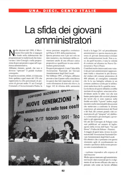 Nel febbraio 1991, a Foligno, abbiamo provato a fare il punto sulla coincidenza tra questi due fatti importanti: un intervento riformatore di notevole rilievo, la legge 142 di riforma delle autonomie locali e la legge 241 sul procedimento amministrativo e questa massiccia presenza di giovani democratico-cristiani nelle amministrazioni locali. Non a caso, da quell'incontro, è nata la volontà di costruire un'alleanza tra Nuove Generazioni e Nuovi Poteri.