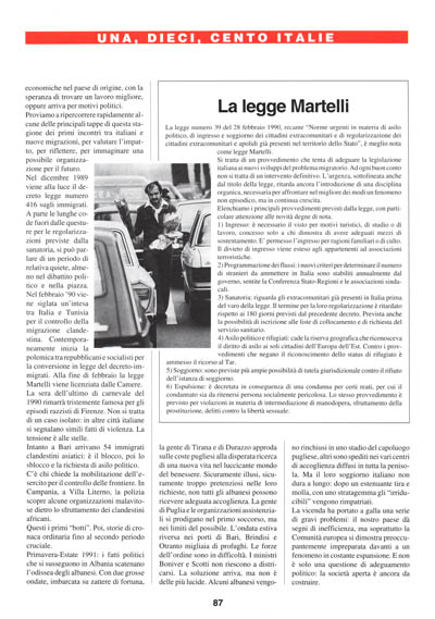 Nel dicembre 1989 viene alla luce il decreto legge numero 416 sugli immigrati. A parte le lunghe code fuori dalle questure per le regolarizzazioni previste dalla sanatoria, si può parlare di un periodo di relativa quiete, almeno nel dibattito politico e nella piazza. Nel febbraio '90 viene siglata un'intesa tra Italia e Tunisia per il controllo della migrazione clandestina. Contemporaneamente inizia la polemica tra repubblicani e socialisti per la conversione in legge del decreto-immigrati. Alla fine di febbraio la legge Martelli viene licenziata dalle Camere. La sera dell'ultimo di carnevale del 1990 rimarrà tristemente famosa per gli episodi razzisti di Firenze. Non si tratta di un caso isolato: in altre città italiane si segnalano simili fatti di violenza. La tensione è alle stelle.