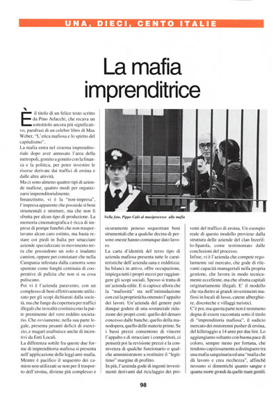 C'è poi, ma questa parte non è nemmeno degna di essere raccontata sotto il titolo di "imprenditoria mafiosa", il sudicio mercato dei minorenni pusher di eroina, del killeraggio a 14 anni per due lire. Lo aggiungiamo soltanto con buona pace di coloro, sempre meno per fortuna, che tendono capziosamente a distinguere tra una mafia sanguinaria ed una "mafia che dà lavoro e crea ricchezza", affinché nessuno si dimentichi quanto sangue e quanta morte grondi da quelle mani gentili.