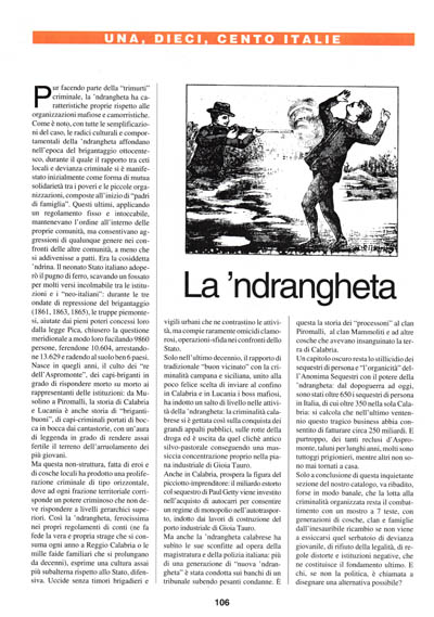 Pur facendo parte della "trimurti" criminale, la 'ndrangheta ha caratteristiche proprie rispetto alle organizzazioni mafiose e camorristiche. Come è not9, con tutte le semplificazioni del caso, le radici culturali e comportamentali della 'ndrangheta affondano nell'epoca del brigantaggio ottocentesco, durante il quale il rapporto tra ceti locali e devianza criminale si è manifestato inizialmente come forma di mutua solidarietà tra i poveri e le piccole organizzazioni, composte all'inizio di "padri di famiglia". Questi ultimi, applicando un regolamento fisso e intoccabile, mantenevano l'ordine all'interno delle proprie comunità, ma consentivano aggressioni di qualunque genere nei confronti delle altre comunità, a meno che si addivenisse a patti. Era la cosiddetta 'ndrina. Il neonato Stato italiano adoperò il pugno di ferro, scavando un fossato per molti versi incolmabile tra le istituzioni e i "neo-italiani": durante le tre ondate di repressione del brigantaggio (1861, 1863, 1865), le truppe piemontesi, aiutate dai pieni poteri concessi loro dalla legge Pica, chiusero la questione meridionale a modo loro fucilando 9860 persone, ferendone 10.604, arrestandone 13.629 e radendo al suolo ben 6 paesi. Nasce in quegli anni, il culto dei "re dell'Aspromonte", dei capi-briganti in grado di rispondere morto su morto ai rappresentanti delle istituzioni: da Musolino a Piromalli, la storia di Calabria e Lucania è anche storia di "briganti-buoni", di capi-criminali portati di bocca in bocca dai cantastorie, con un'aura di leggenda in grado di rendere assai fertile il terreno dell'arruolamento dei più giovani.