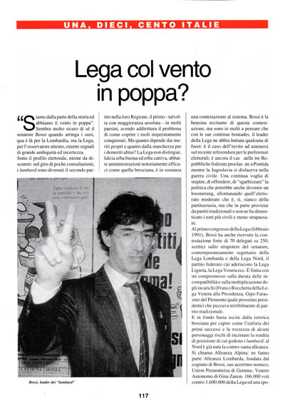 Sotto il profilo elettorale, niente da discutere: nel giro di poche consultazioni, i lumbard sono divenuti il secondo partito nella loro Regione, il primo – talvolta con maggioranza assoluta – in molti. paesini, avendo addirittura il problema di come coprire i ruoli insperatamente conquistati. Ma quanto dipende dai meriti propri e quanto dalla stanchezza per i demeriti altrui? La Lega non distingue, falcia erba buona ed erba cattiva, abbatte amministrazioni notoriamente efficaci come quella bresciana, è in sostanza una contestazione al sistema. Bossi è la benzina eccitante di questa contestazione, ma sono in molti a pensare che con le sue continue boutades, il leader della Lega ne abbia buttata qualcuna di fuori: è il caso dell'invito ad astenersi sul recente referendum per le preferenze elettorali; è ancora il cas delle tre Repubbliche federate proclamate a Pontida mentre la Jugoslavia si disfaceva nella guerra civile. Una continua voglia di stupire, di offendere, di "sgarbizzare" la politica che potrebbe anche divenire un boomerang, allontanando quell'elettorato moderato che è, sì, stanco della partitocrazia, ma che in parte proviene da partiti tradizionali e non ne ha dimenticato i toni più civili e meno strapaesani.