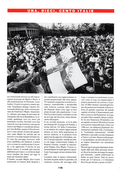 E in fondo basta uscire dalla retorica bossiana per capire come l'euforia dei primi successi e la rozzezza di alcuni personaggi rischi di incrinare la rendita di posizione di cui godono i lumbard: al Nord è già nata la contro-santa alleanza. Si chiama Alleanza Alpina: ne fanno parte Alleanza Lombarda, fondata dal cognato di Bossi, suo acerrimo nemico, Union Piemonteisa di Gemmo, Veneto Autonomo di Gina Zanon. 166.000 voti contro 1.600.000 della Lega ed una ipotesi istituzionale diversa: no alle macroregioni teorizzate da Miglio e Bossi, sì alla trasformazione di Piemonte, Lombardia e Veneto in regioni a statuto speciale. Guardiamo dunque l'ipotesi istituzionale della Lega, nella versione prestata da Gianfranco Miglio. Innanzitutto, saltiamo una tappa ed arriviamo direttamente alla terza Repubblica: la seconda, qualunque cosa sia, nasce già putrefatta e vecchia. Secondo: serve una carica di verve decisionista; è per questo motivo che Miglio è considerato da tempo l'anti-Bobbio: quanto il filosofo torinese è stato attento al tema del garantismo, tanto Miglio ha insistito per un esecutivo con ampi margini di manovra. Ci sono due passaggi successivi nella terza repubblica dei lumbard: il primo serve a creare le condizioni per il secondo, a far apprezzare il fascino di una ipotesi nuova; il secondo può arrivare addirittura per mano e su richiesta degli stessi cittadini che hanno già oggi in mano gli strumenti adatti.