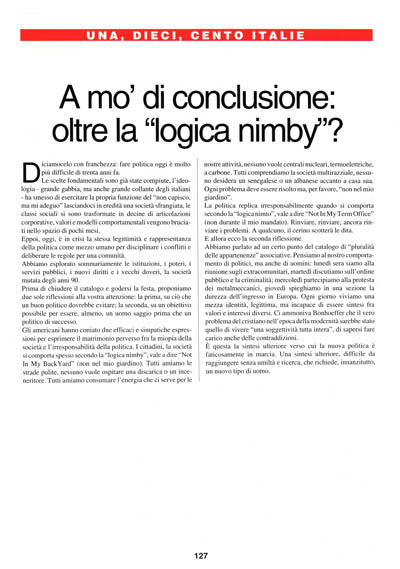Gli americani hanno coniato due efficaci e simpatiche espressioni per esprimere il matrimonio perverso fra la miopia della società e l'irresponsabilità della politica. I cittadini, la società si comporta spesso secondo la "logica nimby", vale a dire "Not In My BackYard" (non nel mio giardino). Tutti amiamo le strade pulite, nessuno vuole ospitare una discarica o un inceneritore. Tutti amiamo consumare l'energia che ci serve per le nostre attività, nessuno vuole centrali nucleari, termoelettriche, a carbone. Tutti comprendiamo la società multirazziale, nessuno desidera un senegalese o un albanese accanto a casa sua. Ogni problema deve essere risolto ma, per favore, "non nel mio giardino".