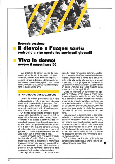 La crisi del mondo giovanile dal '68 in poi è stata analizzata in mille e più modi, e in essa, e nei suoi disperati effetti (purtroppo fanno notizia più quelli) quali la droga o il terrorismo, o il disinteresse e l'individualismo, è rinata la forza del mondo cattolico.