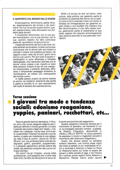 Dunque questa società e in particolare le generazioni giovanili vivono solo di moda pseudo – culturali? Un giorno, hippie con i capelli lunghi, un altro, «stile cadetti di West Point»? Un giorno, paninari da «Burghy», un altro, raffinati «viveur» all'Harry's Bar? Ciò che è sicuro è che negli italiani in particolare, tra i giovani in special modo, c'è oggi una varietà unica di atteggiamenti e bisogni; in una parola, di stili di vita.