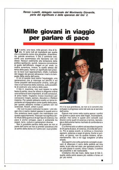 Un porto, una nave, mille giovani. Aria di festa. Ci sono tutti gli ingredienti per quella che si presenta come una possibile, straordinaria, grande avventura. Il GIO' 2 comincia così, come una scommessa che facciamo con noi stessi. Nessun cedimento alla tentazione della politica spettacolo, quindi, nessuna conversione al gusto dell'effimero, magari un po' snob. La nostra avventura, invece, la scelta stessa del tema della pace, hanno un significato ben preciso: la nave vuol rappresentare, infatti, il simbolo del viaggio dei giovani attraverso i mari e le tempeste della storia dell'uomo.