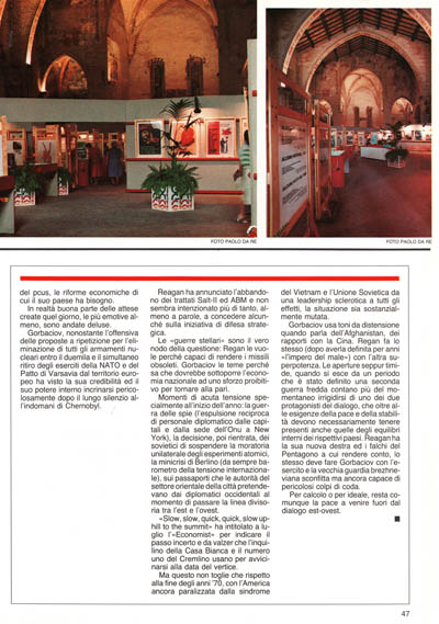 Gorbaciov usa toni da distensione quando parla dell'Afghanistan, dei rapporti con la Cina. Regan fa lo stesso (dopo averla definita per anni «l'impero del male») con l'altra superpotenza. Le aperture seppur timide, quando si esce da un periodo che è stato definito una seconda guerra fredda contano più del momentaneo irrigidirsi di uno dei due protagonisti del dialogo, che oltre alle esigenze della pace e della stabilità devono necessariamente tenere presenti anche quelle degli equilibri interni dei rispettivi paesi. Reagan ha la sua nuova destra ed i falchi del Pentagono a cui rendere conto, lo stesso deve fare Gorbaciov con l'esercito e la vecchia guardia brezhneviana sconfitta ma ancora capace di pericolosi colpi di coda.