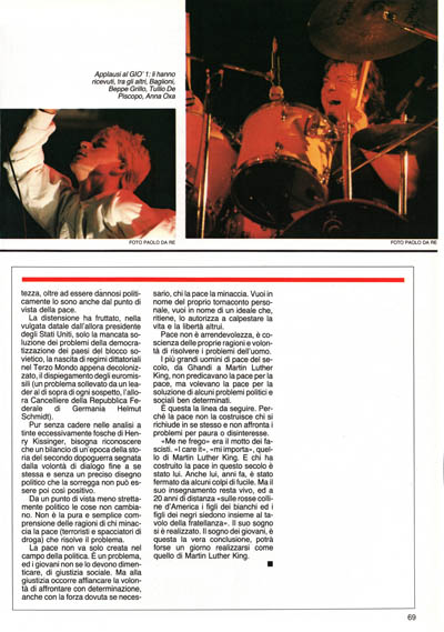 «Me ne frego» era il motto dei fascisti. «I care it», «mi importa», quello di Martin Luther King. E chi ha costruito la pace in questo secolo è stato lui. Anche lui, anni fa, è stato fermato da alcuni colpi di fucile. Ma il suo insegnamento resta vivo, ed a 20 anni di distanza «sulle rosse colline d'America i figli dei bianchi ed i figli dei negri siedono insieme al tavolo della fratellanza». Il suo sogno si è realizzato. Il sogno dei giovani, è questa la vera conclusione, potrà forse un giorno realizzarsi come quello di Martin Luther King.