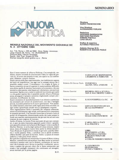 Ecco il terzo numero di «Nuova Politica». Con semplicità, crediamo. stiamo cercando di concretizzare l'idea, la voglia dei giovani dc di avere una propria rivista, uno spazio su cui confrontarsi. dibattere. crescere insieme.