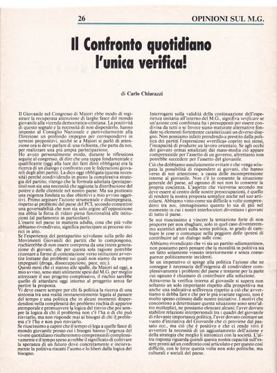 Interrogarsi sulla validità della continuazione dell'esperienza unitaria all'interno del MG, significa verificare se un'azione così combinata ha i presupposti per essere condivisa da tutti o se invece siano maturate alternative fondate su elementi fortemente caratterizzati un diverso disegno. Non possiamo infatti prendendo a prestito dalla politica dei partiti l'espressione «verifica» coprire noi stessi, l'incapacità di produrre un lavoro orientato. Se agli occhi dei giovani ormai smaliziati dai mass-media ciò appare comprensibile per l'assetto di un governo, altrettanto non potrebbe succedere per l'assetto del giovanile.