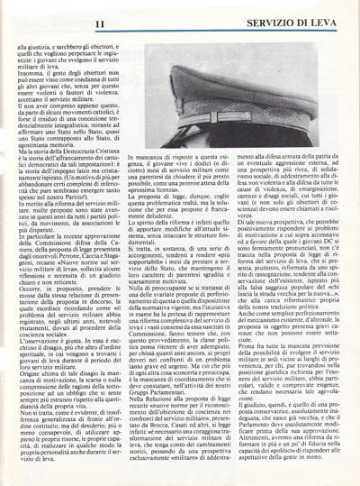 Nella Relazione alla proposta di legge recante «nuove norme per il riconoscimento dell'obiezione di coscienza nei confronti del servizio militare», presentato da Brocca, Casati ed altri, si legge infatti: «è necessario una coraggiosa trasformazione del servizio militare di leva, che tenga conto dei cambiamenti storici, passando da una prospettiva esclusivamente «militare» di addestramento alla difesa armata della patria da un eventuale aggressione esterna, ad una prospettiva più ricca, di solidarismo sociale, di addestramento alla difesa non violenta e alla difesa da tutte le cause di violenza, di emarginazione, carenze e disagi sociali, cui tutti i giovani (e non solo gli obiettori cli coscienza) devono essere chiamati a risolvere».