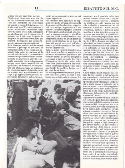A parte le considerazioni sulla struttura del MG, che pure da un lato appaiono discrimanti e dall'altro aprono la strada a imprevedibili conseguenze non prive di rischi, come la professionalità dell'attività politica nelle strutture di vertice, mi pare opportuno concentrare l'attuazione nuovamente ai temi iniziali. Le nuove solitudini ed i nuovi egoismi: è importante comprendere che i linguaggi richiesti sono opposti: per rispondere ai bisogni dei drogati e degli emarginati, per cercare risposte di tipo politico a queste storture della società occorre riacquisire valori del cristianesimo e della solidarietà cristiana. Così pure per l'antagonismo sociale è fuor di dubbio che solo dall'accettazione coerente ed incondizionata di stili di vita più legati al rigore morale e al rifiuto di modelli imitativi e consumistici è possibile recuperare un punto di visione oggettivo al centro. Perciò occorre coniugare solidarietà e rigore morale in modo coerente, fino ai comportamenti personali. fino e oltre il particolare individuale. con uno spirito di servizio senza condizioni, se di certezze, in un mondo dominato dal paradigma relativistico, è impossibile dialogare con i non cattolici, occorre fare in modo, come dice il P. Sorge, da professare le certezze che sorgono dal nostro animo e dalla fede, con la vita quotidiana. La rigorosità morale è un esempio che nasce dalle persone, non dai partiti e neanche alla realtà pluralistica statale e sociale, che in ciò non ha retaggio storico né dignità morale. Rispetto al problema della frantumazione e della corporativizzazione dei conflitti politici occorre ricordare che il ruolo di un partito come la DC è e rimane quello di sintesi delle proposte e delle esigenze della base che, raccolte attraverso il canale istituzionale del partito trovano sbocco nella costruzione del cosiddetto progetto cattolicodemocratico. Questo è ciò che il partito non è stato negli ultimi anni, e che ha fallito dopo gli anni del rinnovamento di Zaccagnini. Il MG ha vissuto di riflesso questa crisi del ruolo istituzionale del partito.
