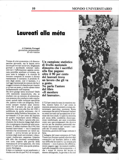 Abbiamo anche saputo, terza notizia, quali sono le lauree che negli anni ottanta offrono maggiori garanzie occupazionali e quali, invece, risultano inflazionate: nel primo elenco si trovano agraria, giurisprudenza, economia e commercio e ingegneria; nel secondo, lettere e filosofia, magistero e sociologia. Un vademecum da non dimenticare per non avere poi brutte sorprese dopo quattro, cinque o sei anni di studio.