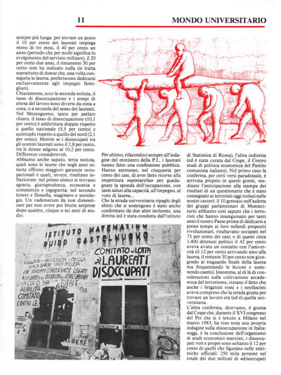Che la strada universitaria ripaghi degli sforzi che si sostengono è stato anche confermato da due altre inchieste, una diretta (ed è stata condotta dall'istituto di Statistica di Roma), l'altra indiretta (ed è stata curata dal Cespe, il Centro studi di politica economica del Partito comunista italiano). Nel primo caso la conferma, per certi versi paradossale, è arrivata proprio in questi giorni, mediante l'anticipazione alla stampa dei risultati di un questionario che è stato consegnato ai terroristi oggi reclusi nelle nostre carceri: il 10 gennaio nell'auletta dei gruppi parlamentari di Montecitorio abbiamo così saputo che i terroristi che hanno insanguinato per tanti anni il nostro Paese prima di dedicarsi a pieno tempo ai loro nefandi propositi rivoluzionari, risultavano occupati nel 75 per cento dei casi; e di questi circa 1.400 detenuti politici il 42 per cento aveva avuto un contatto con l'università (il 12 per cento arrivando sino alla laurea, il restante 30 per cento non giungendo al traguardo finale della laurea ma frequentando le lezioni e sostenendo esami). Insomma, al di là di considerazioni sulla coltivazione accademica del terrorismo, rimane il fatto che anche i brigatisti rossi e i neofascisti aveva compreso che la strada giusta per trovare un lavoro era (ed è) quella universitaria.