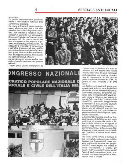 La chiave di lettura di questo appuntamento elettorale non può e non deve guardare solo al dato complessivo nazionale. Non contano le variazioni in percentuale in aumento o in diminuzione dei consensi calcolati sull'intero territorio nazionale; ciò che conta è creare una base di consenso su una proposta di governo della città che permetta alla DC, da una parte, di consolidare le sue posizioni e dall'altra di puntare ad una credibile alternativa di governo rispetto alle «mitiche» giunte rosse che hanno esaurito ormai, nel peggiore dei modi, il loro fascino che sapeva troppo di effimero.