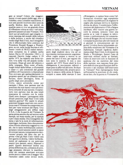filmata altamente suggestiva e reale, che le tante mobilitazioni contemporanee e emotivamente simili in paesi diversi per natura e temperamento derivarono proprio dal fatto che per la prima volta gli Stati Uniti viderò una loro guerra in diretta, videro borbardamenti ed esplosioni in cui potevano esserci loro parenti, amici, fidanzati o padri. Questo determinò inoltre una prima differenza che, a distanza di anni, oggi possiamo rilevare: le manifestazioni dei campus americani avevano molto poco a vedere con il maggio '68 e l'autunno caldo come invece molti, anche in Italia, credettero. La maggior parte degli studenti dava vita ad un movimento intrinsecamente «egoista»: «Non voglio andare a morire in un paese che non è il mio, per ragioni che non sono le nostre». E non a caso quando nel 1973 Nixon abolì la leva obbligatoria il movimento rallentò e dopo poco si affievolì del tutto. Se dopo ciò noi consideriamo che, proprio poco dopo lo smacco della presa di Saigon, scoppiò a causa della stampa il caso «Watergate», si capisce bene come le affermazioni ricorrenti oggi soprattutto tra i «falchi repubblicani» di «tagliare le unghie alla stampa» deriva in maniera diretta da allora. Consideriamo l'affermazione del diplomatico USA a Saigon Jacobson. «Per vincere una guerra occorre la censura; nessuno vince una guerra se si vede il sangue in televisione» e confrontiamola col comportamento di Reagan che nel recente «caso Grenada» ha precluso alle televisioni ed ai giornali le comunicazioni per tre giorni! Un'altra fascia istituzionale colpita dalla «sindrome del Vietnam» è la diplomazia: l'attuale rigidezza diplomatica degli Stati Uniti, le divisioni tra Shultz e Weinberger, fautori l'uno di interventi militari anche se limitati, l'altro di interventi solo in funzione di qualcosa che sia «sentito» dal resto della nazione, non nascono forse proprio dalle diverse giustificazioni dell'intervento e del risultato dell'intervento in Vietnam? Non ripropongono forse nell'attualità la posizione di chi crede, da un lato, che la guerra in Vietnam» fu persa perché non si ebbe il coraggio di vincerla intensificando bombardamenti e presenze statunitensi per paura delle ripercussioni di immagine e dall'altro di chi crede che comunque si sarebbe persa una guerra assolutamente estranea al popolo statunitense? L'attualità della politica statunitense pare mutuare proprio da quegli anni, come è logico, certi comportamenti ormai usuali. Le polemiche e gli attriti attuali tra il Presidente Reagan e il Congresso per la concessione di aiuti ai «contras» nicaraguensi da dove derivano se non dalla frattura profonda imposta dal Vietnam e che si concretò nel «War Power Act», che costringe il Presidente degli Stati Uniti ad avere un voto di fiducià entro 90 giorni dall'invio di truppe americane in zona di combattimento! E comunque, di fronte a tante opinioni, variegate quanto lo possono essere quelle relative a fatti recenti della memoria personale e collettiva, un punto fermo può essere messo: il sondaggio più accreditato, riportato sia da Time che da Newsweek nelle loro inchieste speciali a dieci anni dalla fine della guerra del Vietnam, dicono che se nel 1965 un americano su quattro riteneva la guerra un «errore», e nel maggio del 1970 la percentuale era salita al 56%, ora con la presidenza Reagan eletta dal 60% degli americani coloro che ritengono al guerra del Vietnam un errore sono il 63% dei cittadini degli Stati Uniti.
