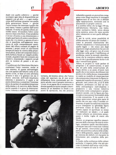 Ci sembra poi che l'abortismo libertario costituisca l'esito coerente, anche se non estremo, di questa antropologia: che cioè parlare dell'aborto come di un diritto civile, in base al noto aforisma «l'utero è mio e lo gestisco io» sia il frutto omicida dell'individualismo edonista e possessivo, il quale a tal punto dimentica e comprime l'interesse altrui da parlare di autodeterminazione della donna e di esercizio della libertà, anche quando è in gioco la determinazione violenta e unilaterale. quindi autoritaria, del destino altrui; che l'unica colpa del nascituro sia di non avere abbastanza forza contrattuale per imporre ad alta voce il proprio interesse a vivere, in un paese che si commuove in difetta quando la morte casuale e drammatica di un bambino in fondo a un pozzo fa spettacolo, ma che protesta infastidito quando un giornalista coraggioso come Biagi trasmette le immagini agghiaccianti di un feto che si difende dalla «aspirazione», mettendo così in discussione le proprie certezze.