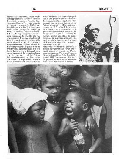 Il Brasile avrebbe avuto bisogno di un mito come Neves nel momento del ritorno alla democrazia, anche perché egli rappresentava il punto d'incontro di interessi contrastanti. Non così il suo successore Sarney, l'ex vicepresidente, per lungo tempo uomo del PDS (il partito più legato ai militari), prima di consentire, con il passaggio del suo gruppo da uno schieramento all'altro, l'elezione di Neves. Sarney resta però un estraneo nella coalizione del PMDB, che raggruppa i partiti di massa e le tradizionali forze di opposizione, e che già avrebbe avuto dei problemi con Neves ad essere maggioranza reale sul piano politico. La difficoltà principale è quella di far riprendere alla gente la fiducia nel confronto democratico, al di là degli entusiasmi passeggeri. Le coraggiose battaglie dei lavoratori, della Chiesa, dell'associazionismo cattolico, hanno costituito un'importante testimonianza durante i venti anni di dittatura.