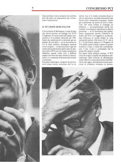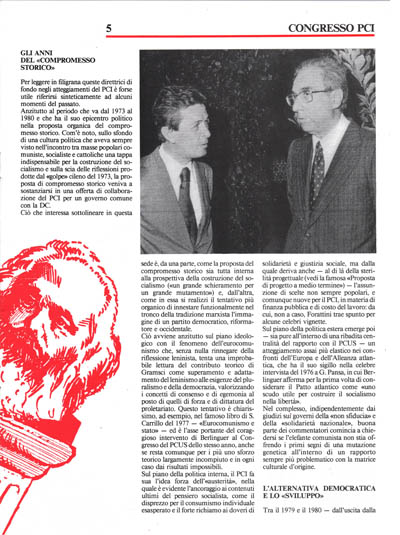 Non ci si può nascondere tuttavia che una progressiva anche se silenziosa acquisizione da parte del PCI di posizioni socialdemocratiche obbliga la stessa DC a riprendere quegli sforzi di elaborazione culturale ai quali essa troppo spesso si sottrae; perché, in assenza di questi, una normalizzazione di stampo europeo del caso italiano in cui si contrapponessero banalmente uno schieramento di tipo laburista socialdemocratico ed uno di carattere liberista-thatcheriano, vedrebbe probabilmente la DC sospinta ad occupare la posizione centrale di quest'ultimo. Il che non ci piace affatto, perché un'alternativa tradizionale di questo tipo si dimostra ovunque inadeguata ad affrontare i problemi epocali del mondo contemporaneo, e perché la tradizione personalistica e solidaristica nella quale ci riconosciamo richiede ben altre risposte da quelle che vediamo in giro. Ma di questo si parlerà un'altra volta.