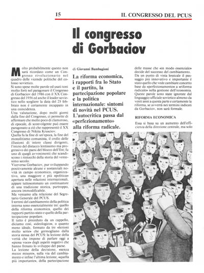 «piena voce» degli aspetti negativi che hanno frenato lo sviluppo del paese. La lezione della decisione, «senza mezze misure», sulla via del cambiamento e infine l'ultima lezione, «quella più importante», della partecipazione delle masse che «in modo essenziale» decide del successo del cambiamento. Da un punto di vista lessicale il passaggio più innovativo e importante è stato quello che vede cambiare concetto base da «perfezionamento» a «riforma radicale» nella gestione dell'economia. Queste parole sono state ignorate dal linguaggio ufficiale sovietico almeno da venti anni a questa parte e certamente la riforma, se avverrà nei termini indicati da Gorbaciov, non sarà formale.