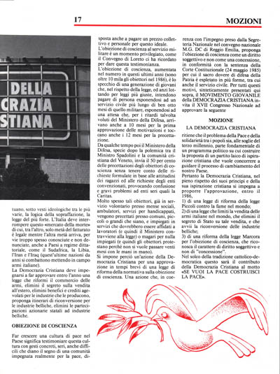 M.G. DC di Reggio Emilia, proponga l'obiezione di coscienza come un diritto soggettivo e non come una concessione, in conformità con la sentenza della Corte Costituzionale (24 maggio 1985) per cui il sacro dovere di difesa della Patria è espletato in più forme, tra cui anche il servizio civile. Per tutti questi motivi, sinteticamente presentati qui sopra, il Movimento Giovanile della Democrazia Cristiana invita il XVII Congresso Nazionale ad approvare la seguente