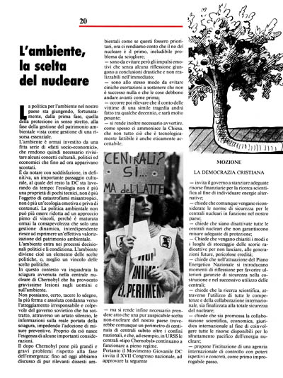 È da notare con soddisfazione, in definitiva, un importante passaggio culturale, al quale del resto la DC sta lavorando da tempo: l'ecologia non è più una proprietà di pochi tecnici, non è più l'oggetto di catastrofismi misantropici, non è più un'ecologia emotiva e priva di contenuti. La politica ambientale non può più essere ridotta ad un approccio pieno di vincoli, perché è maturata ormai la consapevolezza che solo una gestione dinamica, interdipendente riesce ad esprimere un'effettiva valorizzazione del patrimonio ambientale.