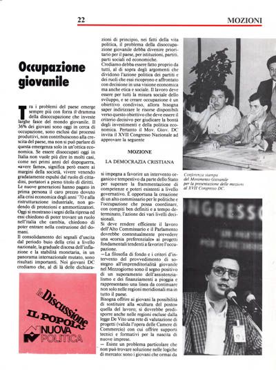 Il consolidamento dei segnali d'uscita dal periodo buio della crisi a livello nazionale, la graduale discesa dell'inflazione e la stabilità monetaria, in un panorama internazionale mutato, sono risultati importanti. Noi giovani DC crediamo che, al di là delle dichiarazioni di principio, nei fatti della vita politica, il problema della disoccupazione giovanile debba divenire prioritario per il paese, per istituzioni, partiti, parti sociali ed economiche.
