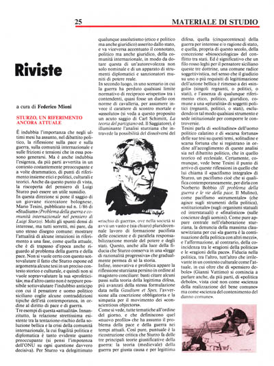 In questa direzione si pone il saggio di un giovane ricercatore bolognese, Mario Tesini, pubblicato sul n. 1/86 di «Studium» (Problema della guerra ecomunità internazionale nel pensiero di Luigi Sturzo). Molti gli spunti densi di interesse, ma tutti sorretti, mi pare, da uno stesso disegno comune: mostrare l'attualità di alcune intuizioni in riferimento a una fase, come quella attuale, che è di trapasso d'epoca anche riguardo al problema della guerra e della pace. Non si vuole certo con questo sottovalutare il fatto che Sturzo espone ed argomenta alcune..tesi in un preciso contesto storico e culturale, e quindi non si vuole sopravvalutare la sua «profeticità»; ma d'altro canto non è neppure possibile sottovalutare l'indubbio anticipo con cui il pensatore e uomo politico siciliano coglie alcune contraddizioni tipiche dell'età contemporanea, in ordine al diritto di pace e di guerra.