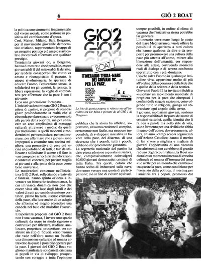 La proposta dei giovani democristiani per la pace, nel programma del GIÒ 2 Boat, contiene l'acquisizione di una coscienza planetaria più rispettosa delle aspirazioni di pace dell'uomo di oggi: una prospettazione che affonda la sua verità nella promozione della civiltà dell'amore, della fratellanza, di un senso più cristiano della vita.