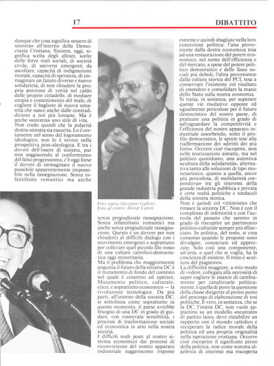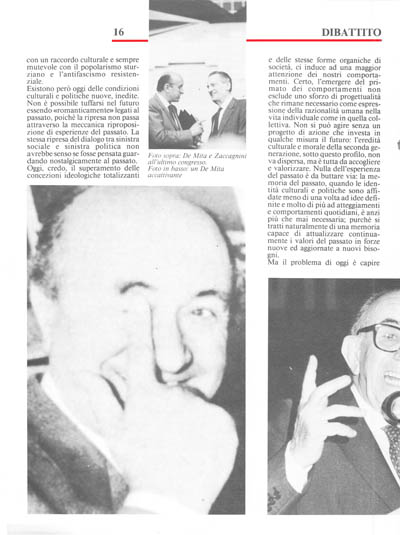 Accanto a questo vi è la necessità, soprattutto per la sinistra dc, di non dimenticare un atteggiamento interiore che è essenziale. Anche sul terreno della politica la sola politica non basta. Le biografie dei grandi uomini che hanno dato espressione storica alla presenza dei cattolici nella vita politica italiana mettono bene in evidenza una dimensione di spiritualità e di vita interiore al di fuori della quale la loro opera risulta indecifrabile: il rilievo vale, anche se in forme varie, per Sturzo come per De Gasperi, per Dossetti e La Pira come per Vanoni o Moro. Questo «di più» rispetto alla politica, che è spiritualità e vita interiore, cultura e senso di umanità, impoverendosi o isolandosi ha impoverito anche la politica. A questo «di più», in parte e non alla sola dimensione politica, è affidato il futuro della presenza dei cattolici nella vita pubblica italiana.