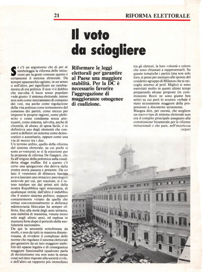 Da qui la necessità sottolineata da molti, e non da tutti in maniera disinteressata, di rivedere il complesso delle norme che regolano il sistema elettorale per garantire da un lato maggiore stabilità del «paese legale» e di conseguenza maggiore funzionalità (qualcuno parla di decisionismo ma non sono la stessa cosa) nel dare risposte alla società civile, e dell'altro un rapporto più immediato tra gli elettori, la loro volontà e coloro che sono chiamati a rappresentarli. Su queste tematiche i partiti (ma non solo loro, si pensi per esempio alle ipotesi del cosidetto «gruppo di Milano» che si raccoglie attorno al prof. Miglio) si sono esercitati molto in questi ultimi tempi preparando alcune proposte (in commissione Bozzi ne sono giunte ben sette) su cui però lo scontro verbale è stato sicuramente maggiore della propensione a discuterne seriamente.