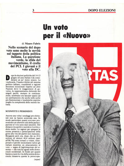 «L'Unità» e Folena (FGCI) per spiegarci che il PCI è il partitq ormai votato solo dagli anziani hanno sostenuto la tesi che i voti giovani alla DC sono voti clientelari e portati da CL. Sulla stessa solfa Notari Stefano («Avanti!»), e altre interpretazioni apparse sugli organi di stampa nazionali (al solito si è distinto il «Corriere della Sera»). Tali tesi possono essere sostenute solo per polemizzare, per nascondere un dato che è omogeneo sull'intero Paese, anche dove CL non c'è, anche dove ci manca il potere per poter fare clientelismo. Tali tesi possono salvare il posto a Folena che dopo aver voluto una FGCI movimentista, autonoma dal PCI, preso sul serio da tanti giovani li ha visti lasciare i comunisti per votare altri partiti. Ma non spiega che il consenso giovanile alla DC nasce dalla sua capacità reale di interpretare meglio di altri partiti i valori in cui le giovani generazioni credono, di aver saputo rispondere alle loro vere aspettative, di aver indicato una strada percorribile per risolvere i tanti problemi che ancora affliggono i giovani. La «maturità» delle nuove generazioni è proprio quella di non lasciarsi incantare dalle sirene della politica spettacolo, dei «movimentisti» inconcludenti dei «barricadieri» alla Capanna riconvertiti alla democrazia ma in perenne attesa di una Rivoluzione che non arriva, dei «nostalgici» della destra.