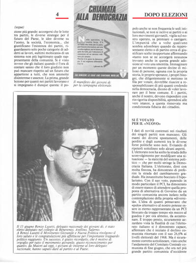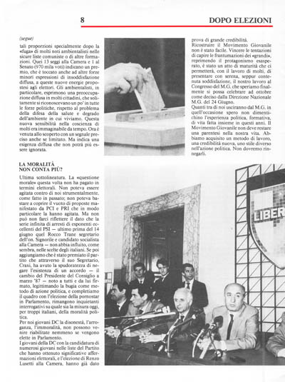 I giovani della DC con la candidatura di numerosi giovani nelle liste del Partito che hanno ottenuto significative affermazioni elettorali, e l'elezione di Renzo Lusetti alla Camera, hanno già dato prova di grande credibilità. Ricostruire il Movimento Giovanile non è stato facile. Vincere le tentazioni di capire le frantumazioni dei «grandi», reprimendo il protagonismo esasperato, è stato un atto di maturità che ci permetterà, con il lavoro di molti, di presentare con serena, seppur contenuta soddisfazione, il nostro lavoro al Congresso del M.G. che speriamo finalmente si possa celebrare ad ottobre come deciso dalla Direzione Nazionale M.G. del 24 Giugno.