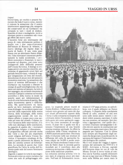L'incontro forse più interessante dal punto di vista strettamente politico è quello con i due capo-ri ercatori dell'Istituto di Ricerca di Arbatoc, il nuovo ideologo del regime dopo la morte di Suslov. È una visita assai franca con un altrettanto franco dibattito. I due ricercatori conoscono perfettamente la realtà occidentale, i problemi economici e finanziari, le nuov proposte sul disarmo, così come sono consapevoli delle difficoltà presenti dell'Unione Sovietica. Il dialogo si sviluppa perciò con enorme sincerità, ammissione di giganteschi errori fatti nel periodo brexzneviano, volontà di maggior integrazione col resto del mondo, demolizione di alcuni miti del pensiero economico marxista. La sensazione che ricavo al termine dell'incontro è che Gorbaciov sta riuscendo a liberare le energie di quell'«intellighenzia» che era stata così castrata nel passato, ha tutto il loro appoggio, sta cercando insomma di costruire il proprio consenso sul mondo scientifico e della ricerca in modo da poterlo usare per ridimensionare il ruolo di certa burocrazia di partito. Battaglia sicuramente aperta e difficilissima. Ma quest'incontro mi lascia anche un lieve malessere, un'impressione di disagio. In occidente siamo così convinti della superiorità della nostra ricerca, della tecnologia, della nostra organizzazione sociale che non studiamo affatto o troppo poco cosa succede nel resto del mondo. Colpisce invece l'acutezza delle osservazioni, il livello non ideologico delle conclusioni, la capacità di analisi che i ricercatori dell'ideologo Arbatov ci dimostrano. Il programma ufficiale prevede anche due visite a due dei più importanti centri religiosi dell'intera Unione Sovietica: il monastero ortodosso di Zagorsk a pochi chilometri da Mosca, la sede dei cattolici armeni ad Echmiardzin. La seconda di queste due visite giustificata fra l'altro la scelta dell'Armenia quale sede del nostro Seminario ideologico.