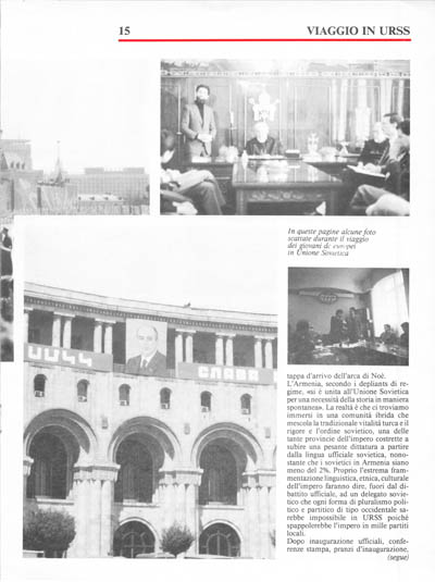 Ma il vero scopo del viaggio è rappresentato dal seminario tra l'EYCD e il KMO. Arriviamo a Erevan, capitale dell'Armenia dopo tre ore di volo da Mosca. Erevan si trova vicino al confine con la Turchia; a pochi chilometri da noi si erge innevato il Monte Ararat, noto nella Bibbia per essere stato la tappa d'arrivo dell'arca di Noè. L'Armenia, secondo i depliants di regime, «si è unita all'Unione Sovietica per una necessità della storia in maniera spontanea». La realtà è che ci troviamo immersi in una comunità ibrida che mescola la tradizionale vitalità turca e il rigore e l'ordine sovietico, una delle tante provincie dell'impero costrette a subire una pesante dittatura a partire dalla lingua ufficiale sovietica, nonostante che i sovietici in Armenia siano meno del 2%. Proprio l'estrema frammentazione linguistica, etnica, culturale dell'impero faranno dire, fuori dal dibattito ufficiale, ad un delegato sovietico che ogni forma di pluralismo politico e partitico di tipo occidentale sarebbe impossibile in URSS poiché spappolerebbe l'impero in mille partiti locali.